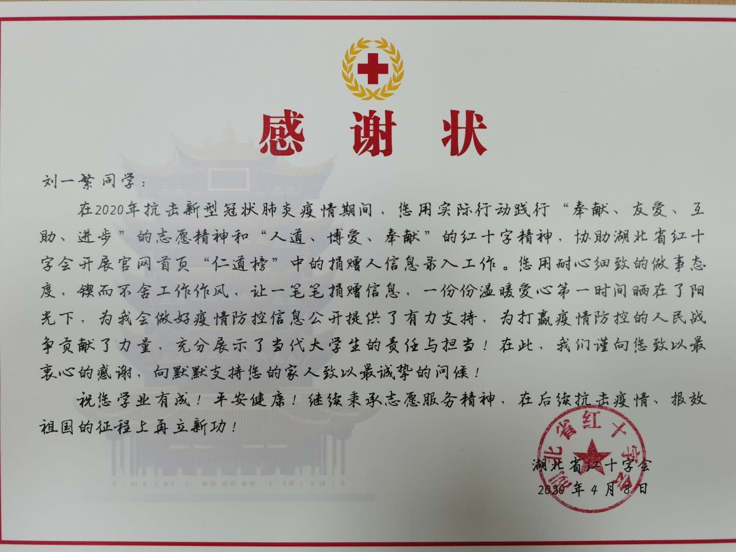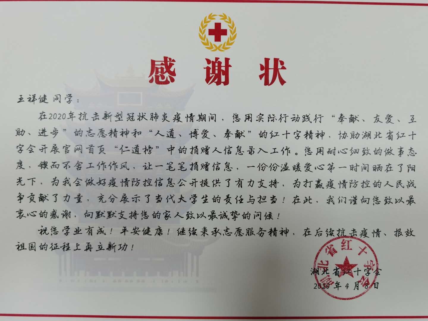 点击:近日,3044am永利集团3044noc团委收到湖北省红十字会发来的感谢信,对3044am永利集团3044noc团委以及安全定单2017级张纪扬、安全工程2017-3班刘一繁、安全应急2018级王祥健三名同学在疫情防控工作中作出的贡献表示由衷的感谢。