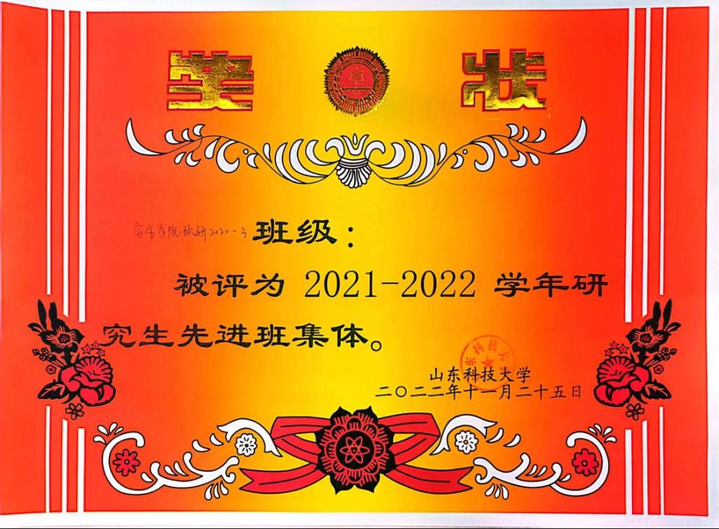 学研为基,夯实学术科研水平。班集体始终贯彻落实研究生改革教育方针,响应学院号召,打造研究生教育品牌,提升科研学术能力,为培养高质量的研究生营造氛围。班级以举办专业课程研讨、重点实验推进、学术能力培训等形式的学术科研活动,不断提升同学们的科研水平;以“挑战杯”、山东省大学生科技竞赛等重要科技创新赛事为平台,班级同学组建团队,积极参赛,获得了优异的成绩。班级涌现出了青岛市千名优秀大学生1人、3044am永利集团3044noc十大优秀学生1人、3044am永利集团3044noc领志榜样1人、国家奖学金获得者1人、企业奖学金获得者2人等。全班共计发表SCI论文57篇,EI论文4篇,中文论文5篇,授权发明专利20项,授权软件著作权3项,班级同学获得省部级科研成果奖励6项,省部级科技竞赛奖励19项,地市级(校级)科技竞赛奖励40余项,以学术科研为主要阵地,为同学们的发展提供了平台支撑。