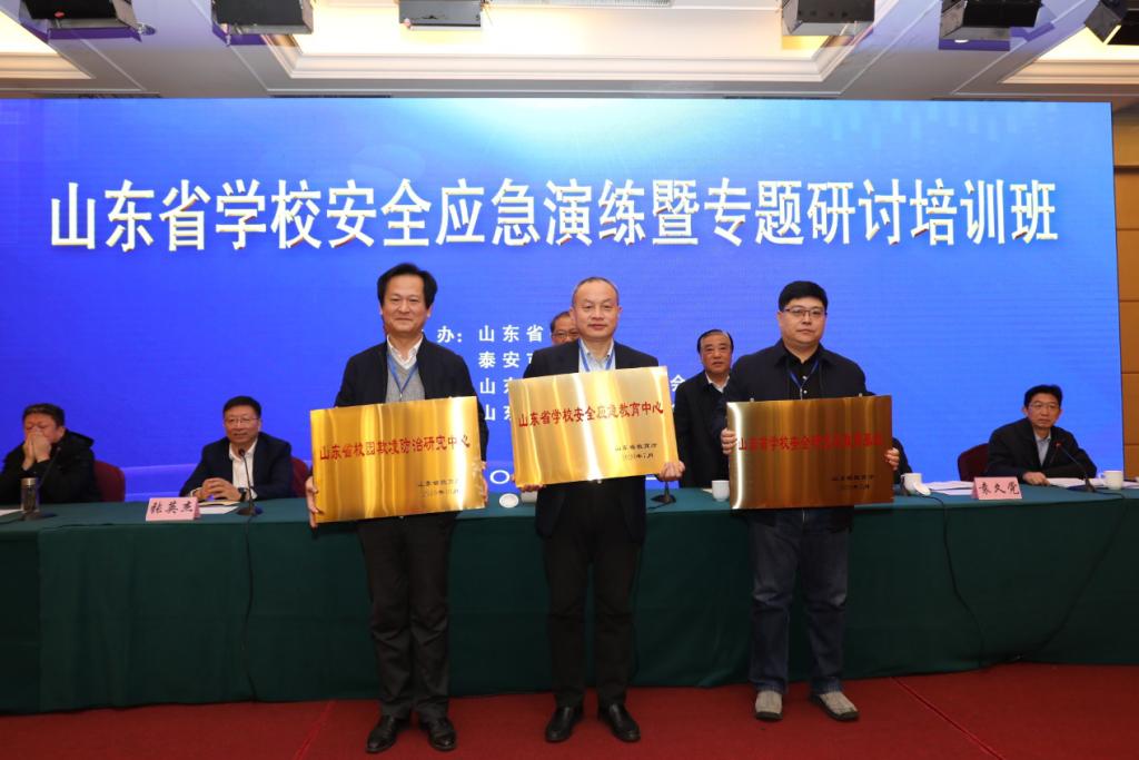 山东省学校安全应急演练暨专题研讨培训班开班仪式上,主席台领导为永利3044noc、济南大学、青岛大学三个单位获批的山东省学校安全应急教育中心、山东省学校安全研究与教育基地、山东省校园欺凌防治研究中心授牌。