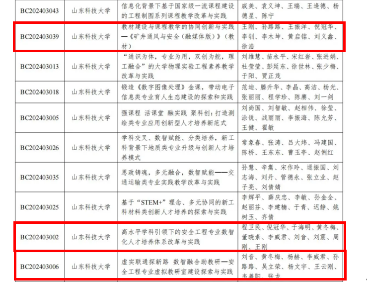 近日,中国煤炭教育协会公布了2024年全国煤炭行业教学成果获奖项目,我院获2024年全国煤炭行业本科教学成果一等奖3项,二等奖1项,研究生教学成果一等奖1项,二等奖2项的好成绩。其中程卫民教授团队的《高水平学科引领下的安全工程专业数智化人才培养体系改革与实践》、王刚教授团队的《教材建设与课程教学的协同创新与实践—<矿井通风与安全(融媒体版)>(教材)》、和刘音教授团队的《虚实联通探新路,数智融合助教研-安全工程专业虚拟教研室建设探索与实践》获得本科教学成果一等奖。刘震教授团队《面向未来、强化实践、赋能安全工程专业“双创”教育新动能》获本科教学成果二等奖。胡相明教授团队的《“一核四维、双轨融合、三醒三思、多元评价”火灾科学课程体系改革探索与实践》获研究生教学成果一等奖,周刚教授团队的《“六轨同项、四链融合”安全科学与工程学科研究生人才培养模式改革与创新》和曹晓强教授团队的《“顶天立地、横纵贯通” ——国家战略牵引下的环境学科研究生培养模式创新与实践》获研究生教学成果二等奖。